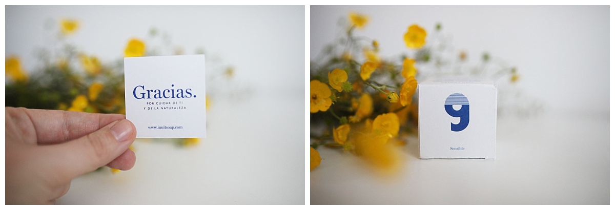 Por un lado tenemos el jabón de Inuit nº9. Este jabón está indicado para pieles sensibles, ya que ayuda a mantener la piel hidratada y calmarla. sus ingredientes son agua de iceberg, aceite de oliva virgen y aceite de caléndula. Ambos aceites están extraídos de cultivo ecológico y obtenidos mediante presión en frío para poder ofrecernos todas las propiedades que ofrecen los ingredientes. Es un jabón totalmente artesanal ya que están hechos a mano. además de eso no contienen ningún tipo de ingrediente tóxico, libre de parabenos, derivados de petróleo o aceite de palma.